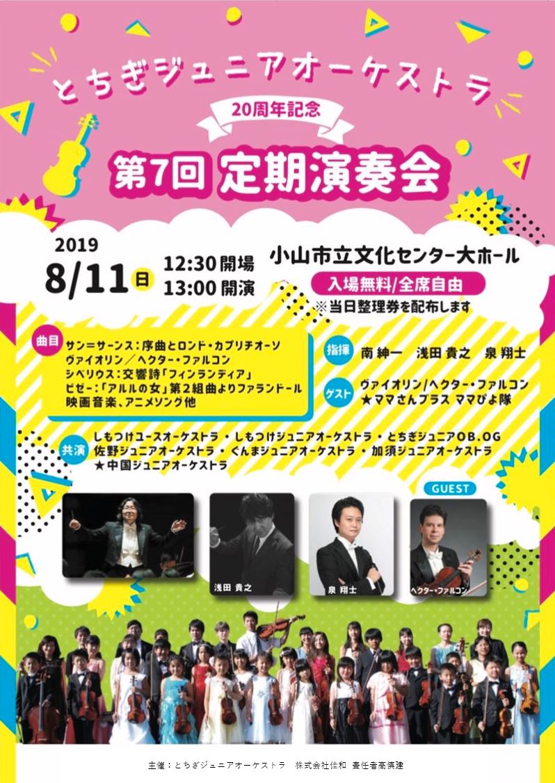 全日程: 2019年8月8日-8月14日 合宿場所: 那須高原自然の家 公演日時: 2019年8月11日 公演場所: 小山文化センターホール 参加団体: とちぎジュニアオーケストラ 日本少年少女オーケストラメンバー 中国の音楽を学ぶ青少年たち 指導先生: 南 绅一(指揮者) 南 傑(ファゴット) Hector Falcon(ヴァイオリン) 主催: とちぎジュニアオーケストラ 株式会社佳和 企画/制作: 株式会社佳和 責任者:高慎建 ポスター指導&演奏会